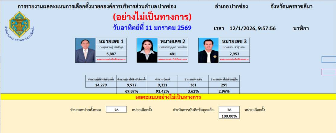 ประกาศผลการนับคะแนนผู้สมัครรับเลือกตั้งนายกองค์การบริหารส่วนตำบลปากช่อง อำเภอปากช่อง จังหวัดนครราชสีม�