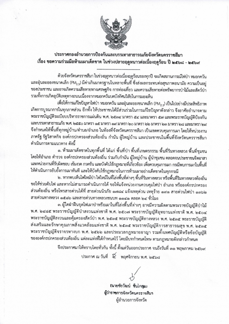 เรื่อง ขอความร่วมมือห้ามเผาเด็ดขาด ในช่วงปลายฤดูหนาวต่อเนื่องฤดูร้อน ปี 2568-2569